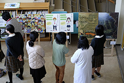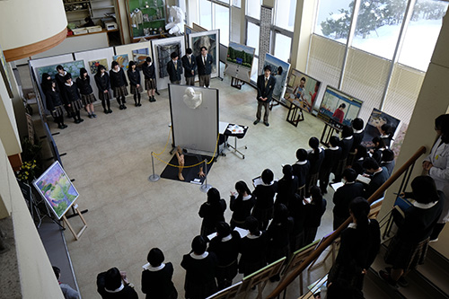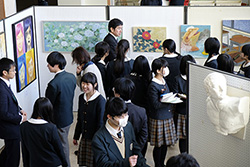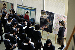 展示作業となったこの日、昼休みを利用してギャラリートークが行われました。各作品の作者に直接話を聞けるという事で、美術専攻1,2年生と先生方が集まり、気になる作品を前に、作者の話を熱心に聞き入っていました。