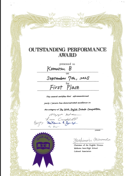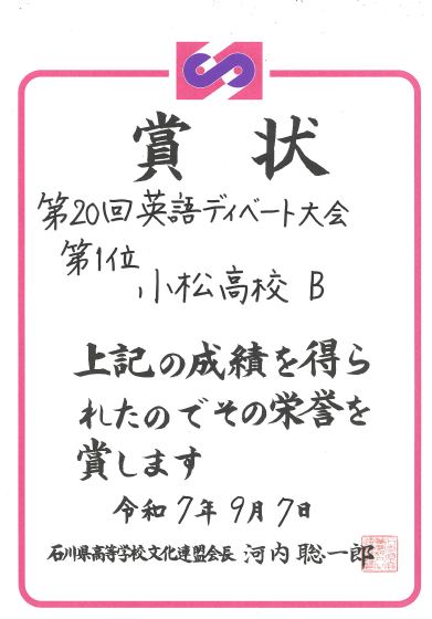 第20回石川県高校生英語ディベート大会にて、小松高校Bチームが優勝しました!