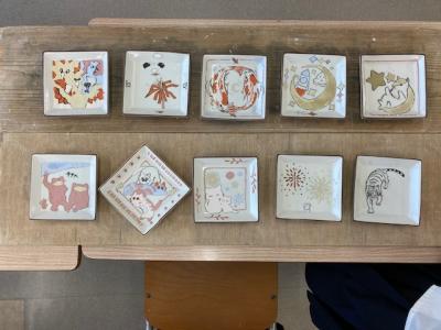 焼きあがったらどんな色になるのか想像しながら、角皿に絵を描きました。