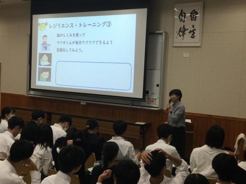 10月27日(金)、「毎日がワクワクする〇〇の魔法」という題目のもと、教育相談室の森田教諭によるレジリエンスについての講義を聞きました。今後の人生においてはもちろん、日々の生活や2年後に立ち向かうことになる受験においても最も重要な力の1つとなるレジリエンス(回復力)を少しずつ皆で身につけていきましょう。