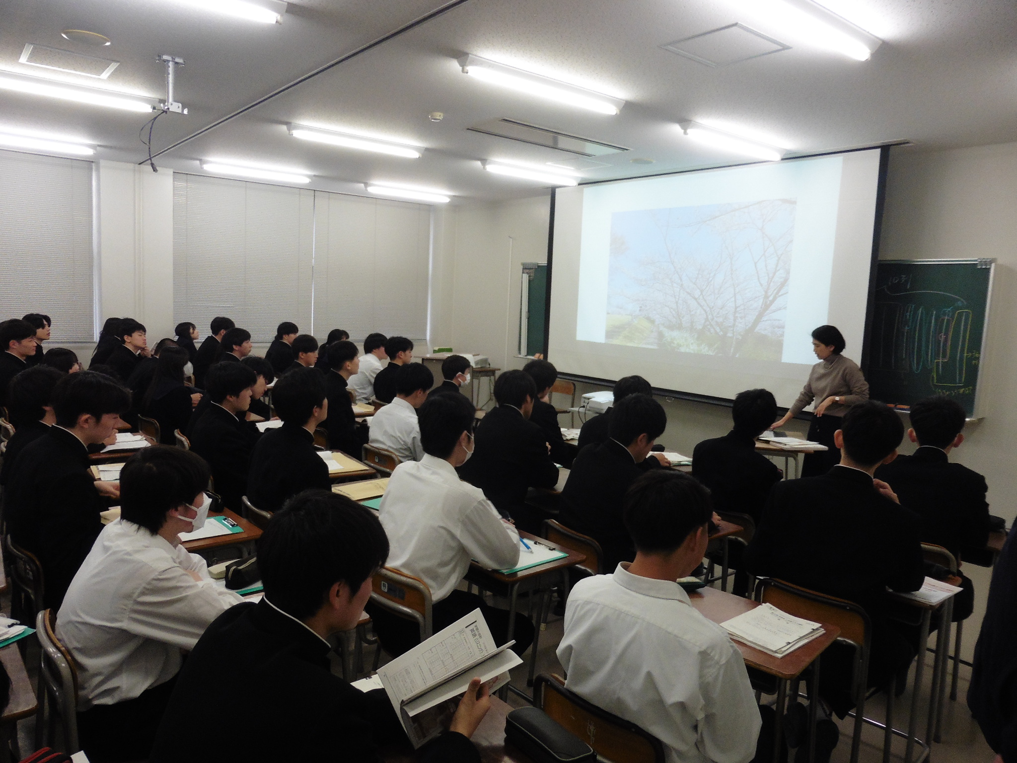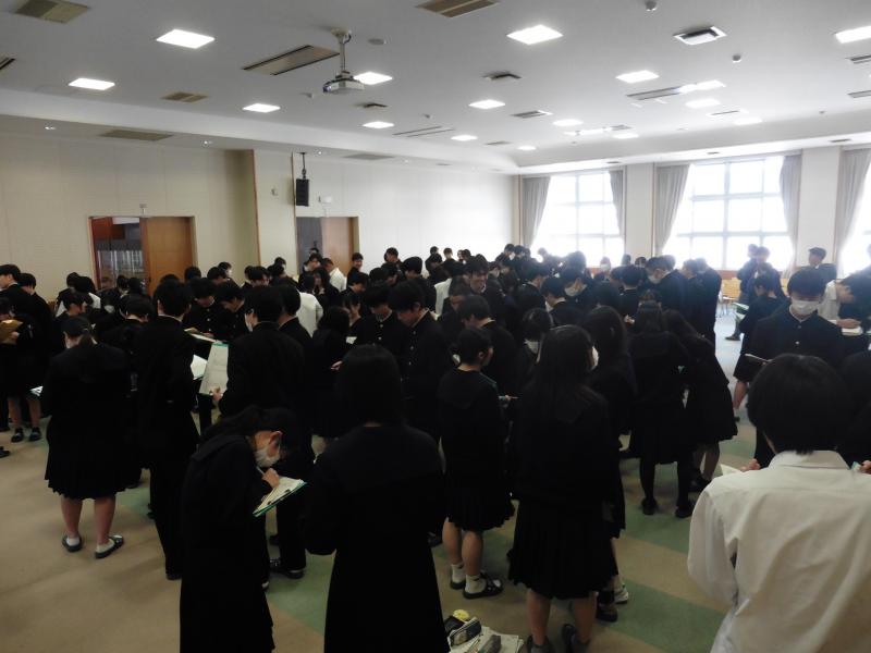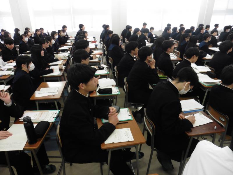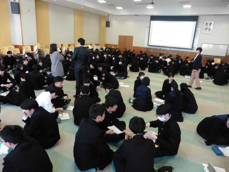 午前中は、4クラスずつに分かれ、多目的講義室で共通テストについての説明、実際に共通テストタイプの問題を解答した上での解説・講義、並びに、「2年生に向けて」というタイトルのもと教育相談室が企画した、新クラスでも各自が豊かな人間関係を形成していくことができる一助となるようなアクティビティに参加しました。