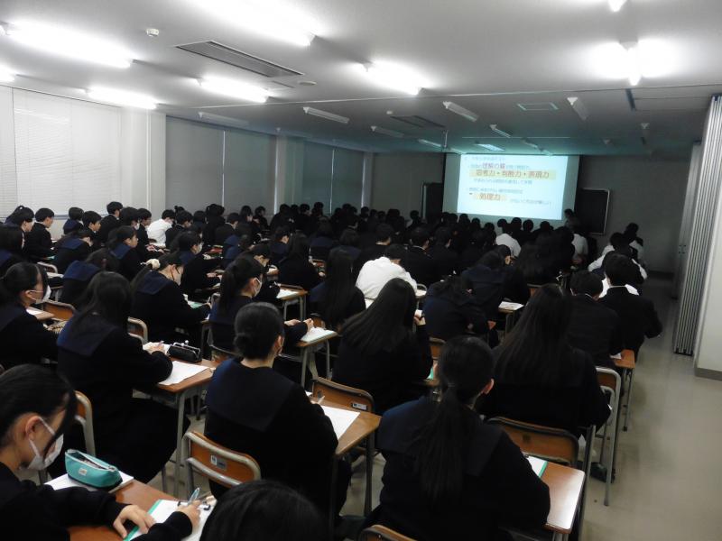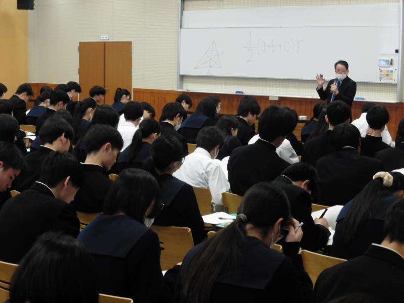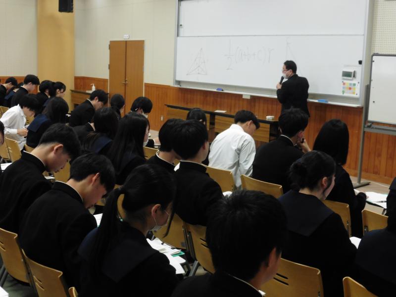 午後は、外部講師の先生に来校いただき、図形と計量の問題についての解説を中心に、高校1年生の間に身につけるべき事柄や入試問題に取り組む際の心構えなどの講義を聞きました。