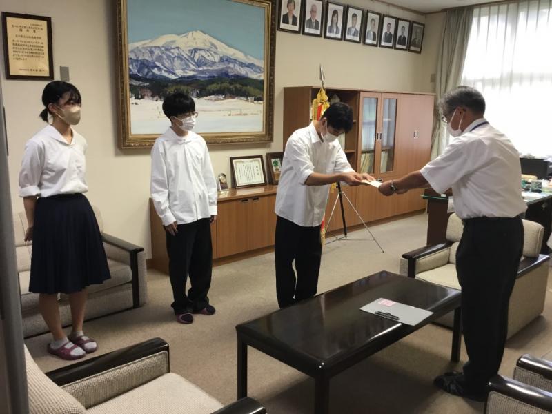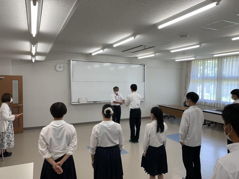 「第74回中部日本卓球選手権大会」に出場する卓球部の皆さんに7月14日(木)の昼休みに校長先生から激励のことばがあり、激励金が渡されました。各選手の健闘をお祈りいたします。