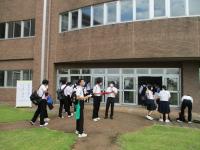 12時40分に地震発生の放送。生徒・職員は机の下にもぐり身を守る行動。地震の揺れは約1分間。その後火災報知器が作動し、火災の確認、火災発生の放送で生徒玄関先に避難開始しました。
