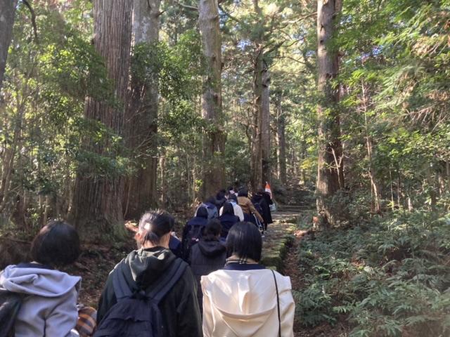 3日目B隊は午前中「熊野古道」を徒歩で見学し、昼食を「那智の滝」付近で食べました。百聞は一見に如かずとはよく言いますが、実際に世界文化遺産を目にすると、生徒たちは1000年以上の歴史を肌で実感している様子でした。