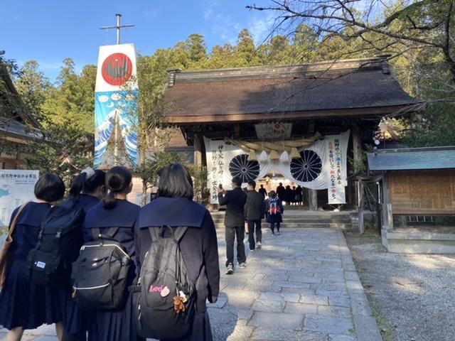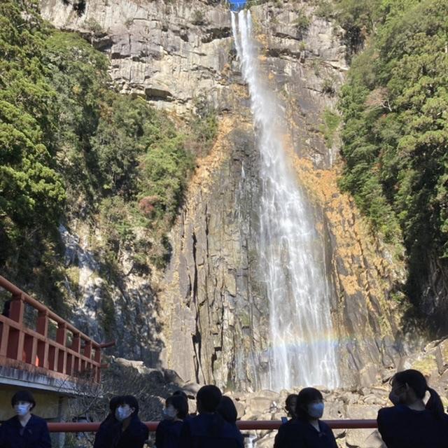 A隊の修学旅行2日目。午前中は世界遺産の熊野古道を歩き、熊野那智大社・那智山青岸渡寺・那智の滝へ行きました。少しハードでしたが、神秘的な石畳の上を多くのパワーを感じながら歩き、最後の那智の滝ではその美しさと豪快さに生徒は圧倒され感動している様子でした。