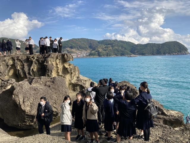 A隊の修学旅行3日目。午前中は熊野本宮大社と鬼ヶ城に行きました。今回の修学旅行で訪れてきた世界遺産「紀伊山地の霊場と参詣道」の最後の訪問地となり、この3日間を通して、歴史や文化、自然を大いに体感することが出来ました。