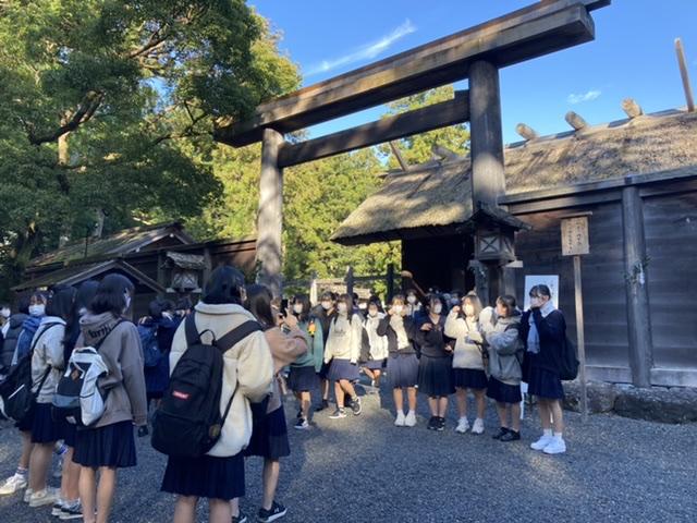 初日B隊は昼過ぎに伊勢神宮(外宮)に到着し、17時の内宮集合までの4時間ほど「班別自主研修」をおこないました。内宮には「三種の神器」の1つである「八咫鏡(やたのかがみ)」が納められているため、最近古典で学習をしたばかりの生徒たちは興味津々の様子でした。