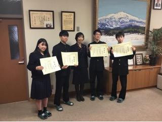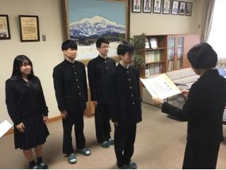 3月3日(火)卒業式後、校長室にて、生徒会活動に功績のあった4名に、生徒会自治功労賞の授与がありました。この賞は生徒会活動において3期以上の生徒会役員、各種委員会の委員長を務めた生徒に贈られます。