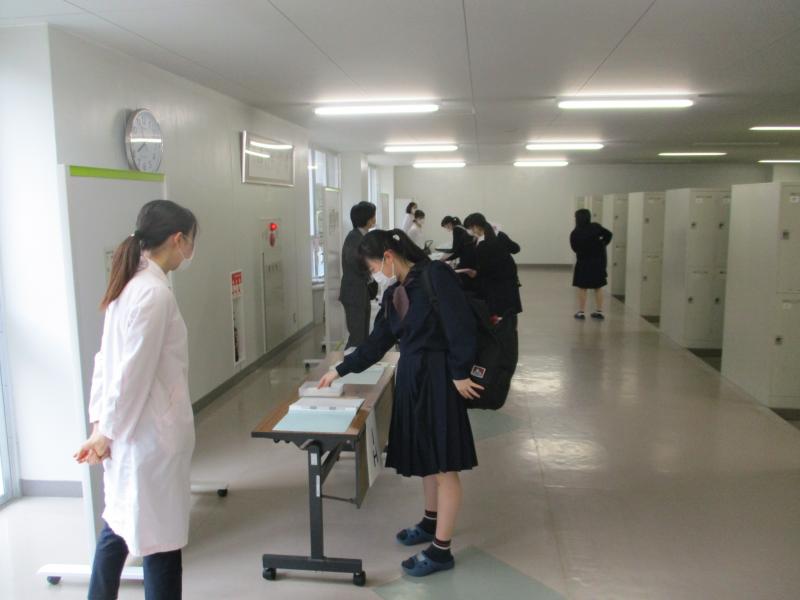 生徒玄関で健康チェックカードを提出