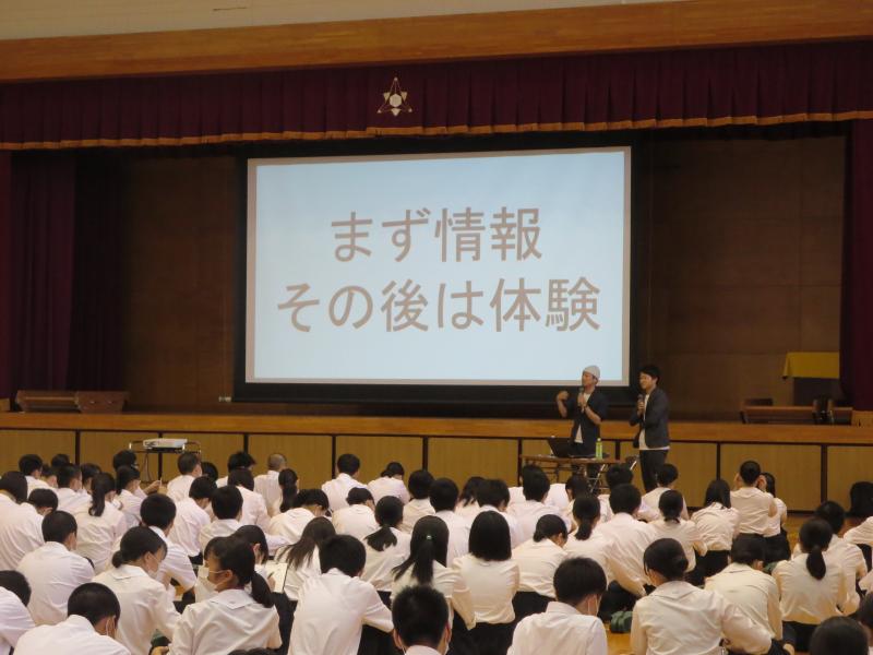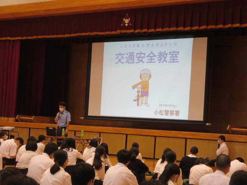 本日、小松警察署から2名の方をお招きし、1年生全体に対し防犯安全教室を行いました。高校生活を送っていて巻き込まれてしまいそうな話の数々に、生徒は真剣に聞いていました。