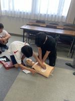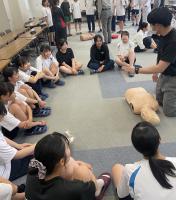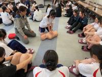 1,2年保健委員と運動部の代表が参加し、実際に人形を使って心肺蘇生法やAEDの使い方を学びました。また、これからの時期に起こりうる熱中症への対策・予防についてもお聞きしました。