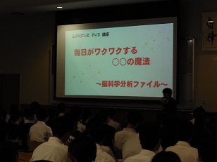 「毎日がワクワクする〇〇の魔法」と題して、「言葉」のもつ力、可能性を信じ切ることの大切さを脳科学的に迫る内容に、生徒たちは聞き入っていました。