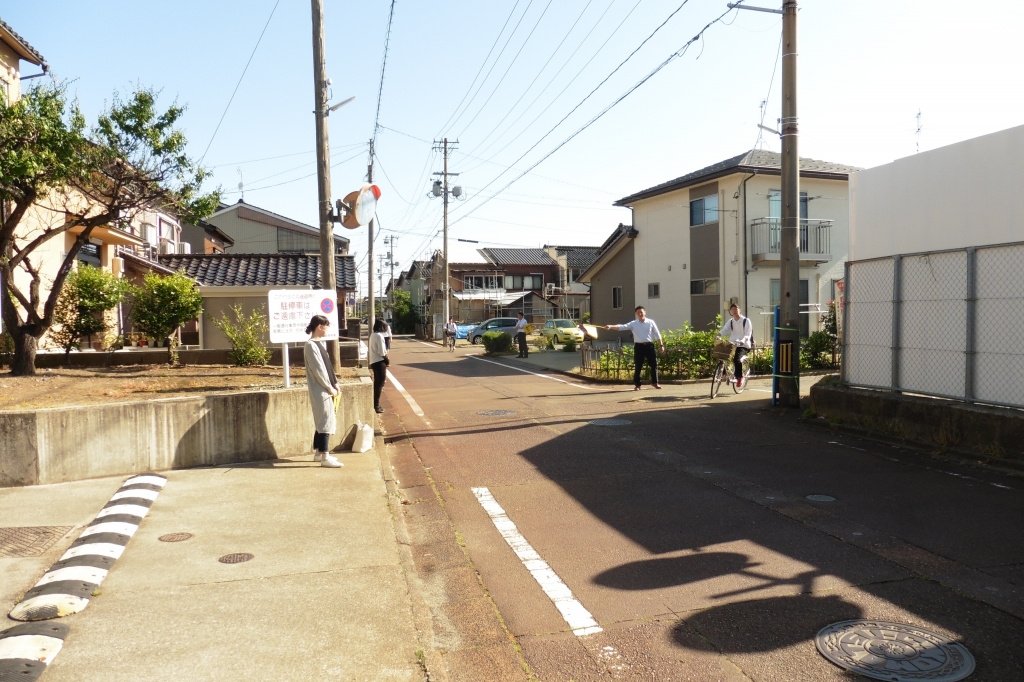 保護者の方々や教員が校門や周辺道路に立ち、挨拶や交通安全指導を行いました。