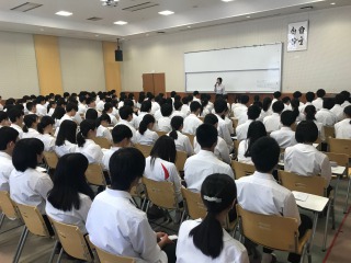 NTTドコモから講師の先生をお迎えし、私たちの生活と切り離せない存在であるスマホ・ケータイとの適切な使い方について学びました。途中、質問や動画も交えながらの講演で、生徒は身近な問題としてスマホ・ケータイとの付き合い方を学べました。