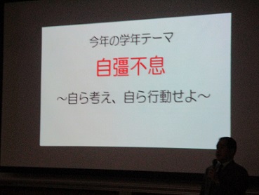 2年生のテーマは「自彊不息(じきょうふそく)~自ら考え、自ら行動せよ~」です。2年生は、進路実現にとって大事な学年である一方で、高校生活に慣れ、ややもすれば中だるみしかねない時期でもあります。