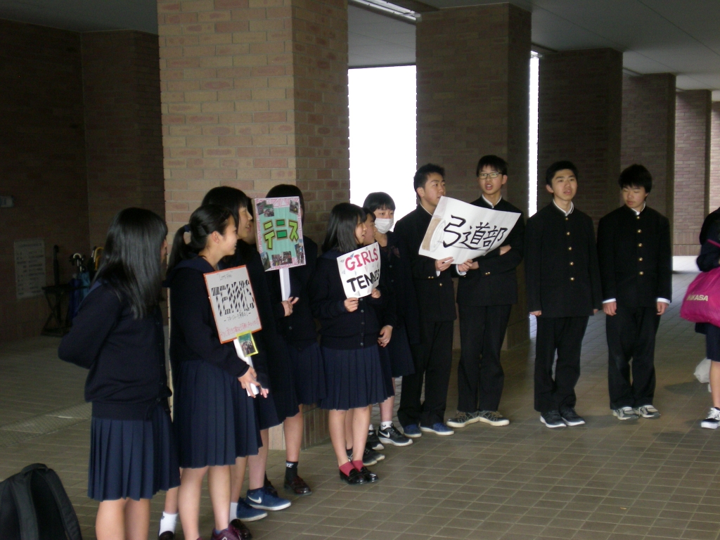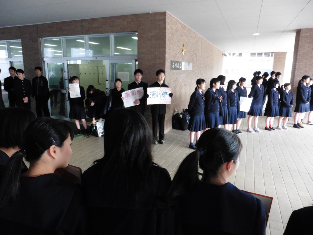 生徒会では、各部の代表による朝の挨拶運動を4月9日(火)から15日(月)までの間、行っています。月曜日の入学式から小松高校生となった新入生たちを、朝早くから気持ちの良いさわやかな挨拶で迎えます。新たな部員の募集にも力を入れており、各部、自作の看板を作成して掲げてアピールをしています。