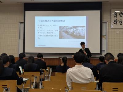 大学院という場所がどのような場所なのか、また、経済とは何か、その歴史や成り立ちから講義していただきました。授業後の質問コーナーでは、「吉川さんが留学したきっかけはなんですか?」といった今後の進路を見据えた質問や「日本の経済は復活しますか?」といった経済について気になることを意欲的に尋ねる生徒の姿も見られました。分かりやすい講義、丁寧な質問への返答をありがとうございました。貴重な経験をした生徒たちでした。
