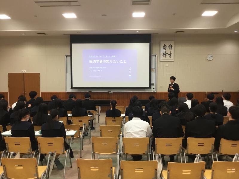 京都大学が高大接続・高大連携活動の一環として、全国的に展開している学びコーディネーター事業を利用し、京都大学 経済学研究科 経済学専攻 博士後期課程2回生 吉川 英輝さんによる出前授業「経済学者の知りたいことー経済発展のメカニズム」を12月13日(金)6限、普通科文系2年生を対象に行っていただきました。
