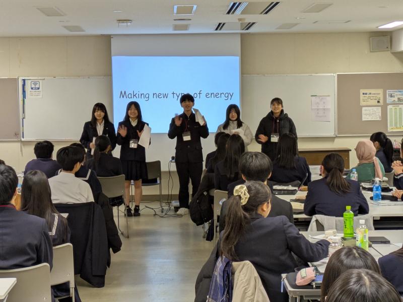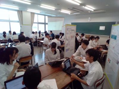はじめは緊張した面持ちの生徒たちでしたが、他のNSH校の生徒と交流しながら、探究活動の一連のプロセスを学びました。また、活動はすべて英語で行われました。悪戦苦闘しながらも培ってきた英語力を活かし、生徒たちは留学生と共にグローバルな視点で探究を行っていました。