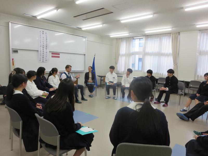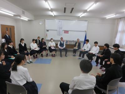 また、放課後には「2024年「EUがあなたの学校にやってくる」」第二部として、大使と生徒による座談会が行われました。1年生から3年生の17名が参加しました。英語による闊達な議論が行われ、ここでしか大使に聞けないことを聞いた生徒たちは達成感や満足感に満ちた様子でした。今日の貴重な経験を糧として、生徒たちは次の学び、次の挑戦に取り組んでいきます。