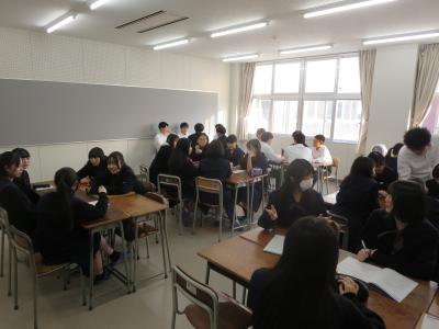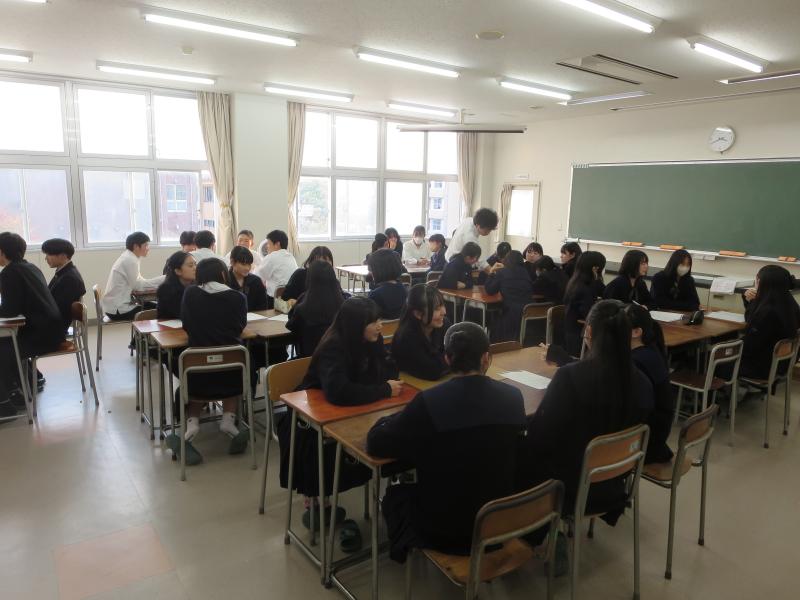 また、発表会終了後には来校していただいた先生方、本校の人文科学課題探究Ⅰ担当の先生方と生徒たちによる座談会が開かれました。1月に予定されている石川県生徒課題研究合同発表会における口頭発表をする班の選考も兼ねた本発表会でしたが、今までの研究の成果を十分に発表し、今後のさらなる研究の進展に向けて考えを練り直す機会となりました。