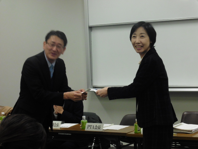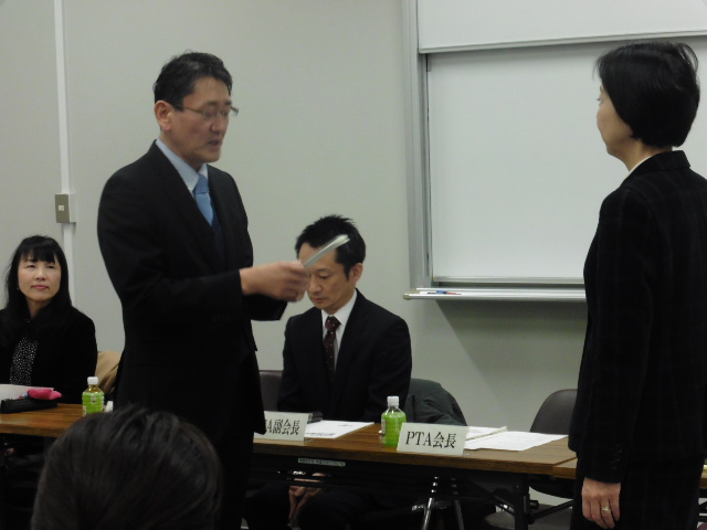 まず実行委員会Ⅰとして、今年度のPTA活動報告や決算見込報告、バザー収益金目録贈呈があり、学校側からは現況報告がありました。また昨年11月26日に開かれました臨時支部総会での内容の報告もありました。