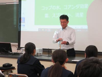 4月には、各学年でSSH学校設定科目の開講式行われました。19日(金)に開催された2年理数科「課題研究Ⅱ」の開講式では、米口校長先生が「コップの水はなぜ落ちないのか」と「コアンダ効果」の2つの原理の実験を見せてくれました。さらに校長先生からは、「不思議だと思うテーマに出会い、探究し続けて、聞き手に驚きがあるような研究をして欲しい。分からないことはしんどいが、楽しいという経験をしてください。みなさんの楽しむ姿を楽しみにしています。」という激励の言葉がありました。生徒は校長先生の実験に大変盛り上がって、刺激を受けていました。