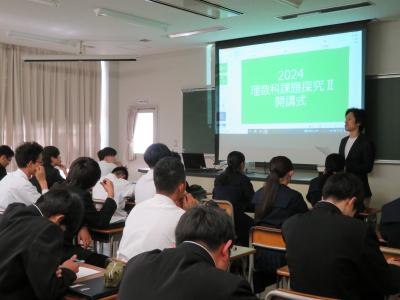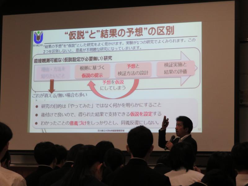 4月26日(金)2年理数科対象の「課題探究Ⅱ」において、石川県立大学の中谷内修先生をお招きし、課題探究についての特別講義が行われました。中谷内先生からは、探究活動の意義や方法、注意点などを説明していただきました。生徒はとても興味深く話を聞いており、探究活動への興味・関心が高まったのではないでしょうか。今後の活動での生徒の活躍が楽しみです。