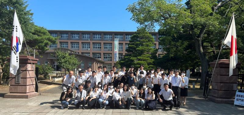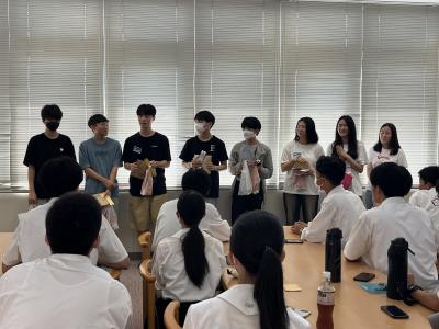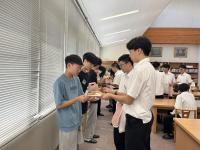 7月27日(木)3日間の国際科学交流を終えた韓国大田科学高校のみなさんが帰国前に小松高校に来校しました。交流してきた28Hの生徒も沢山集まり、校内を案内した後、図書館でお別れ会を行いました。韓国の生徒さんたちがこの3日間の科学交流についての感想を英語で発表してくれて、記念品を渡したり、記念写真などを撮り合ったりした後、韓国の生徒さんたちは小松高校から小松空港へ向かい、帰国しました。