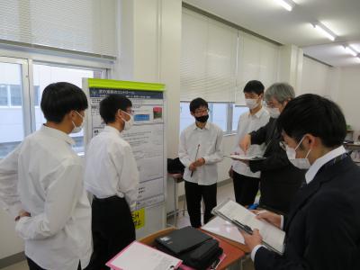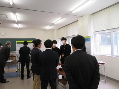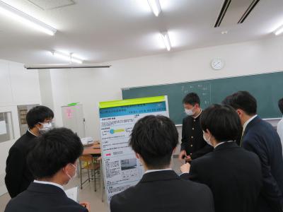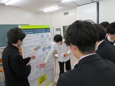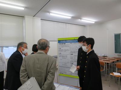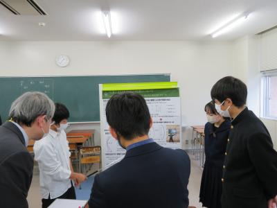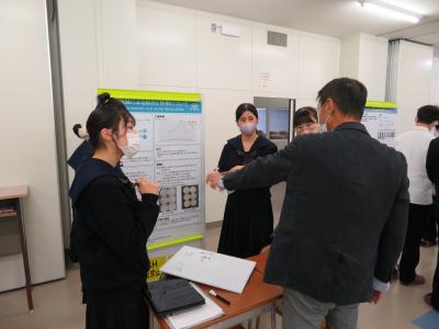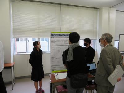 また、6限目は理数科1年生を対象にポスターセッションを行いました。ここでも熱心な質疑応答が行われ、多くの理数科2年生からは「ポスター発表では、言葉足らずの箇所があり、指摘していただいたので、来週の発表会に向けて直したいと思います。」「ポスターのテーマと結論が上手くかみ合っていないというご指摘を受けたので、修正したい。とても楽しかったし、このような機会を与えてくれたことを感謝します。」という声が聞かれ、参観した理数科1年生からは「来年自分たちの番になると考えると、とても難しそうに感じて、先輩達はさすがだなと思った。」いう声が聞かれました。そして、今回指摘していただいたことを12月13日(火)に行われる石川県SSH生徒研究発表会に生かせるように、ポスターの内容を再検討しました。