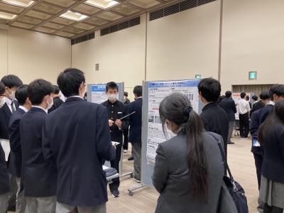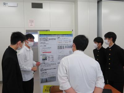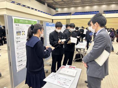 SSH指定3校とNSH校の金沢二水高校による口頭発表が行われ、本校からは、11月の校内選考会で選ばれた理数科2年生の課題研究2グループ「3×3ルービックキューブにおけるねじりの判別」と「弓道における弦音の性質について」が代表として口頭発表を行いました。また、すべての参加校から課題研究のポスター発表が行われました。ここで、本校理数科2年生の生徒達は、講評者の大学の先生方や、他校の生徒達や先生方から、研究に対する質問や講評をいただくことができて、今後の研究の参考にすることができました。そして、参観者として参加した本校理数科1年生は来年度に取り組む課題研究の参考になるよう、熱心に質問をしていました。