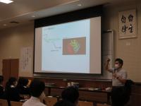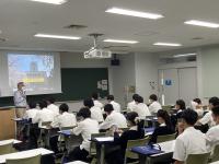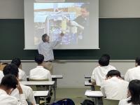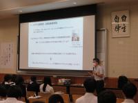 内橋先生は「見て触って理解するタンパク質の働きー分子生物学の最前線」という題目で、「生物物理学」という領域融合分野の最先端の研究に関する講義をしてくださいました。生徒達は、ナノレベルの極小の世界で分子のダイナミックな動きを、直接観察したり触れたりできるまで科学が進歩しているということに感嘆し、研究はさまざまな分野から広い視野で考えることが大切であるということを学びました。