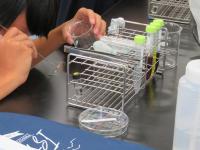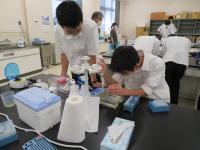 セミナーBでは生物資源工学研究所助教中谷内修先生が「電気泳動法によるmRNAの分離、検出についての講義と実験」の指導をしてくださいました。mRNAからを逆転写酵素によってcDNAを作製し、PCRによって増幅させ、電気泳動により分離後、ゲル内のDNAを切断し、染色して、観察しました。生徒からは「昨年度のサイエンスツアーでの実験内容とつながりを感じながら、セミナーを受講することができた。」「RNAの抽出という高度な実験ができて嬉しかった。」「セミナーを通して自分がまだまだ知識不足であることを認識し、これからの学習への意欲が高まった。」という声が聞かれました。