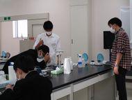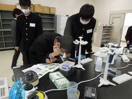 石川県立大学では、中谷内先生のご指導のもと、「河川に存在するDNAの分析」という内容で、河川水に含まれる外来魚DNAをリアルタイムPCRで増幅させ、電気泳動で分析しました。生徒たちはバイオテクノロジーの一端に触れ、遺伝子を扱う細かい作業を班で協力しあいながら熱心に取り組んでいました。