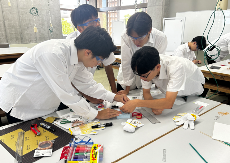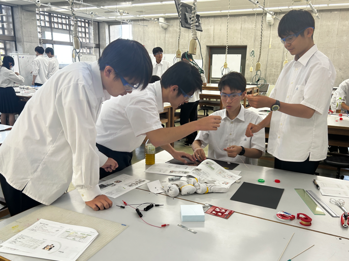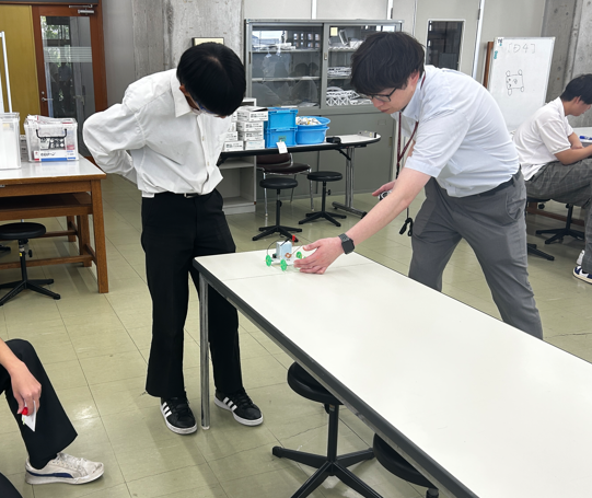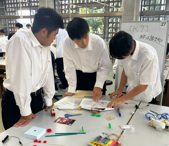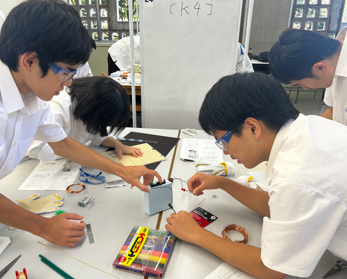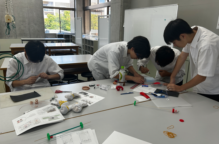 銅線を巻いてコイルを作り、磁石や電池を組み合わせてモーターを完成させました。そのモーターを車体に取り付け、試行錯誤を重ねながら走行できる車を作り上げました。限られた材料と時間の中で、効率よく回転力を伝える工夫や、車体の安定性を高める工夫が求められ、チームで協力しながら改善を繰り返しました。