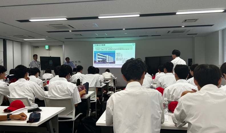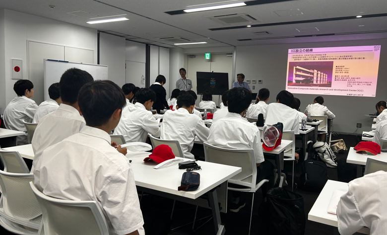 見学では、複合材料の特性や応用分野についての説明を受け、研究設備を間近で見ることができました。航空機や自動車、スポーツ用品など幅広い分野で活用される複合材料の可能性に、生徒たちは大きな関心を寄せていました。