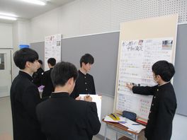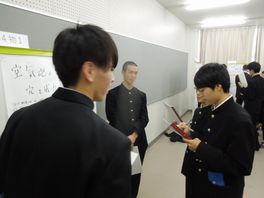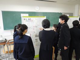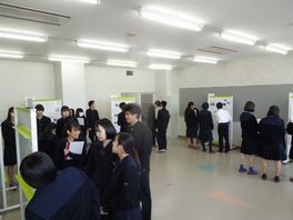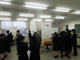 半年間取り組んできた2年生普通科理系の課題研究のポスター発表会が行われました。数学、物理、化学、生物、体育の5分野の研究についてポスター発表を行いました。自分達が設定したテーマに対して研究を行ってきたので、みんな自信を持ってポスターセッションをしていました。また、他のポスターにも熱心に質問をしていました。
