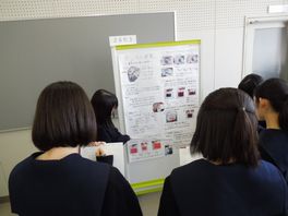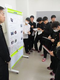 どの班も同じ実験の方法(中和滴定)でしたが、わかりやすいポスター作成や説明の仕方など、班によっていろいろ工夫している様子が見られ、とても興味深く視聴することができました。発表者も視聴者も熱心にポスターセッションしていました。来年度、2年生で行う課題研究がとても楽しみです。
