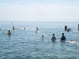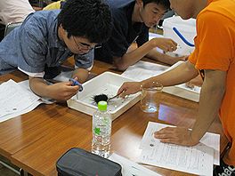 1日目は午前中、海に入って海洋生物採集をしました。これから人工授精させるウニとその他の海洋生物を班ごとに採取しました。みんなウェットスーツを着用し、一生懸命海に潜り、班員が協力し合って採取していました。午後からは、ウニの人工授精を行い発生の様子を夜までずっと顕微鏡観察しました。