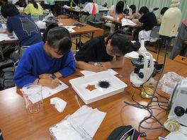 2日目は午前中ウニ発生観察を継続して行いました。午後は前日に採取した海洋生物の観察と同定を行いました。また、のと海洋ふれあいセンターの坂井恵一先生に棘皮動物についての講義を受けました。棘皮動物の性質や構造について詳しく説明して頂き、棘皮動物に親しみが生徒達は前日に自分達で採取した生物だったため、興味も思い入れもあり、とても大切に扱いながら熱心に観察していました。