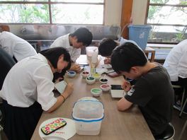 まず、食品に含まれる微生物についての講義、食品サンプルから抽出した微生物の培養、顕微鏡による微生物の観察を行いました。韓国大田科学高校の生徒達も一緒にセミナーに参加し、理数科の生徒達のグループにそれぞれ混ざって、英語でコミュニケーションをとりながら協力して実験を行いました。そして、次の日の準備をして1日目を終えました。