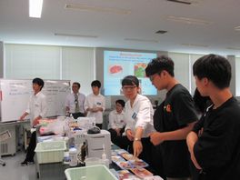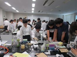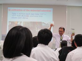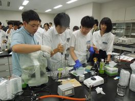 7月29日(月)、石川県立大学で「大学実験セミナー」が行われました。石川県立大学食品科学科准教授小柳喬先生が講師として、食品に含まれる微生物についての講義と実験の指導してくださいました。また、アドバイザーとして生物資源工学研究所助教中谷内修先生が指導・助言してくださり、TA(ティーチングアシスタント)として、大学院生・大学生11人が指導補助にあたってくださいました。