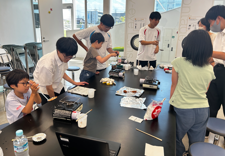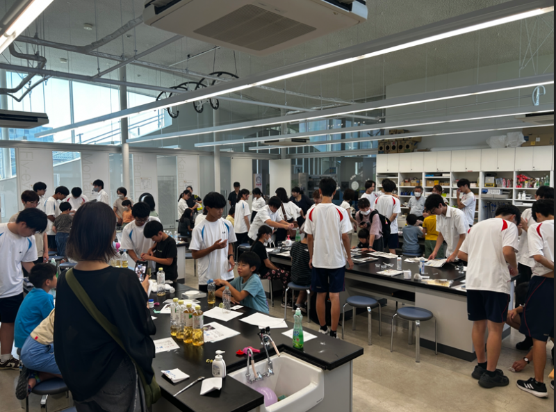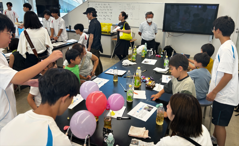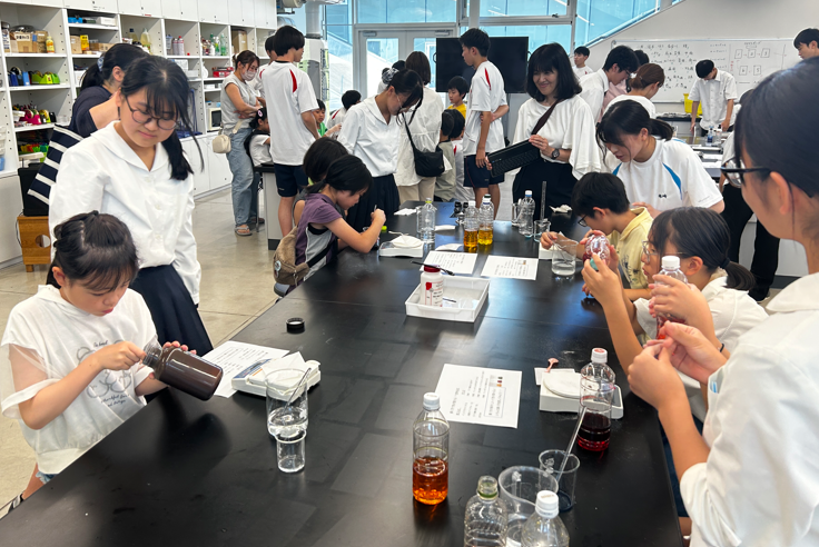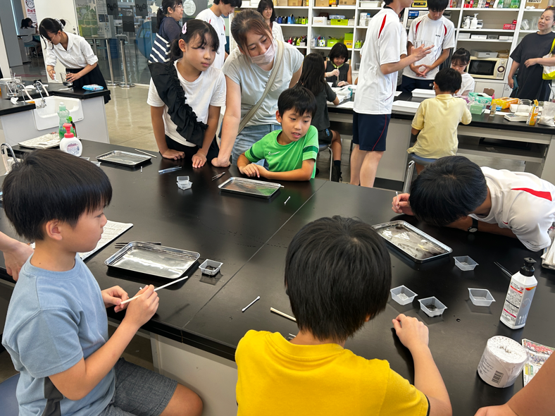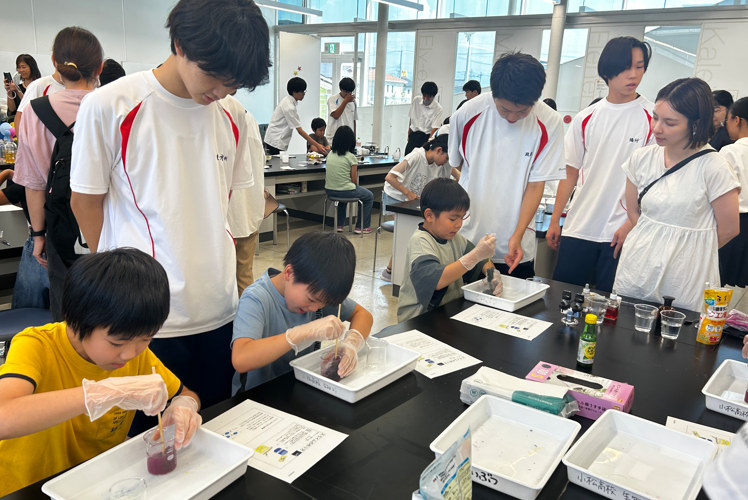 小学生たちは目を輝かせながら実験に取り組み、高校生の説明に熱心に耳を傾けていました。