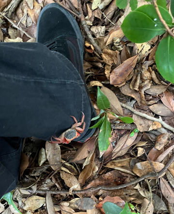 照葉樹林だけではなく、アカテガニの楽園ともなっています。アカテガニは陸上生活に適応したカニです。年々減少しているそうですが、この日もいたるところで観察することができました。