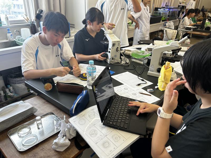 14:00 昼食後、学校に戻り、ウニ胚の観察を継続しました。