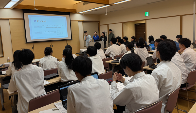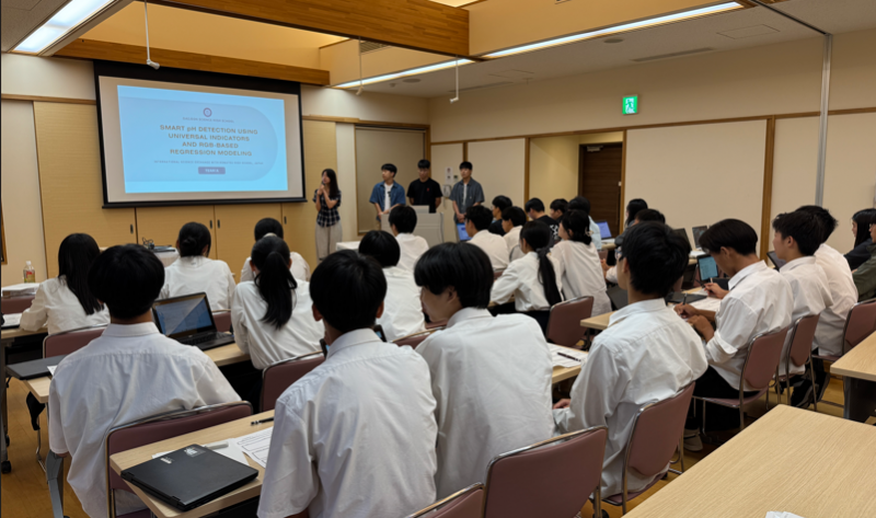 その後、共同研究の内容について、韓国の高校生から説明を受けました。研究テーマは3本です。3つのグループがプレゼンを行いました。