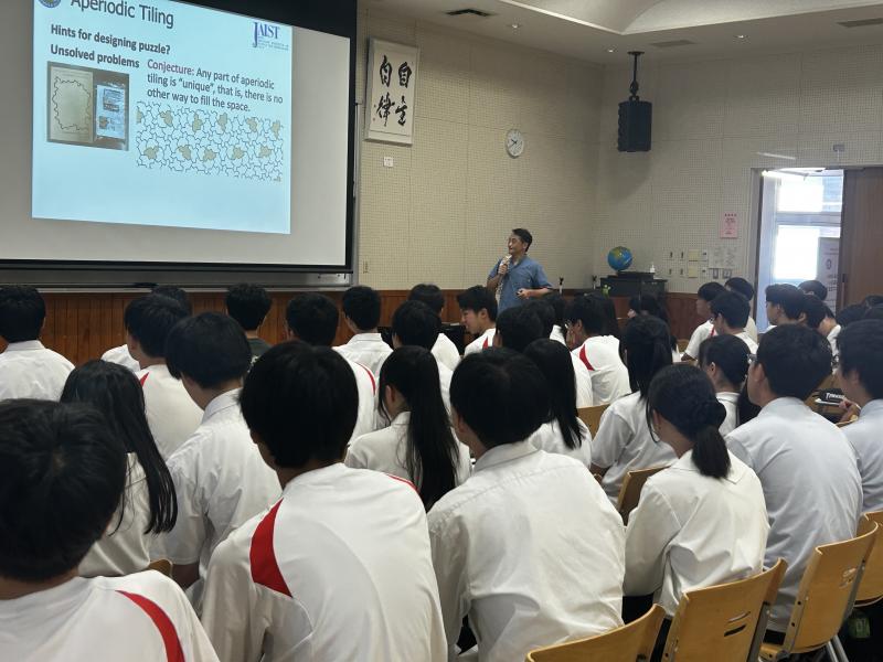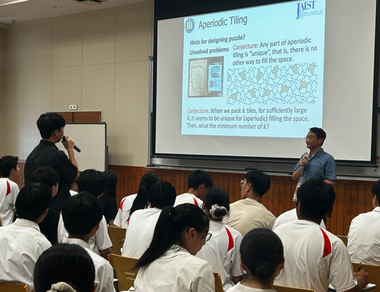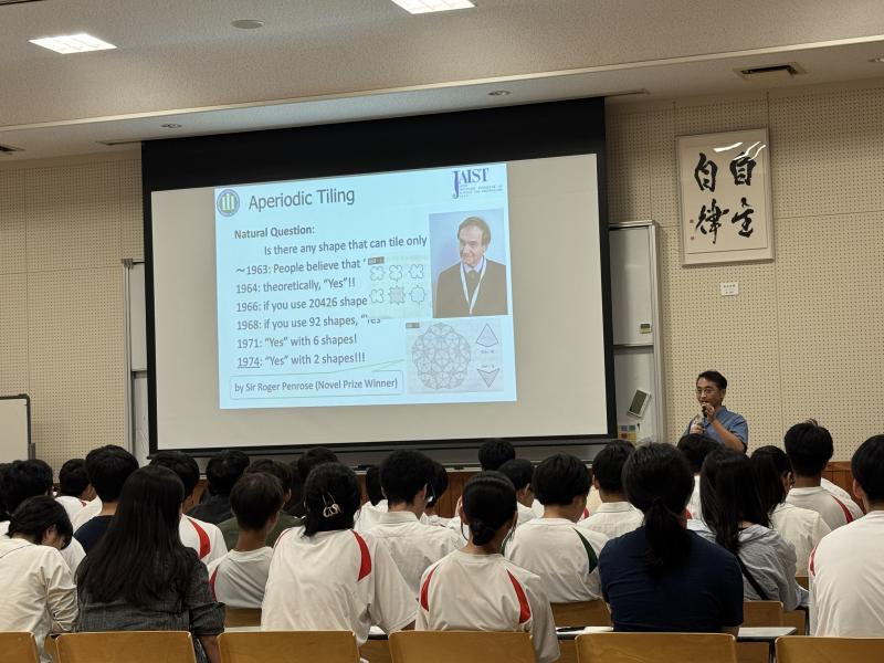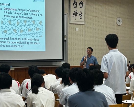 非周期性パズルに関する講義を、すべて英語で受けました。講義では、研究の歴史や背景、パズルの仕組みに加え、これから自分たちで作るアインシュタインタイルのポイントについても学びました。