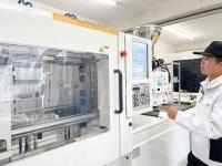 射出成型機という機械を使って、プラスチックのつぶつぶを溶かして、定規やメダルの形を作ります。