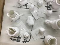 粉末の状態のものに水などの材料を混ぜで、泡を取り除き、そこから型に流し込んでいろいろな形を作るようです。
